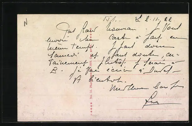 Personenbezogene Daten auf der Rückseite der Karte wurden durch blauen Textmarker unkenntlich gemacht. Die blauen Stellen sind auf die Vorderseite durchgeweicht und wirken sich negativ auf das Postkartenfoto aus