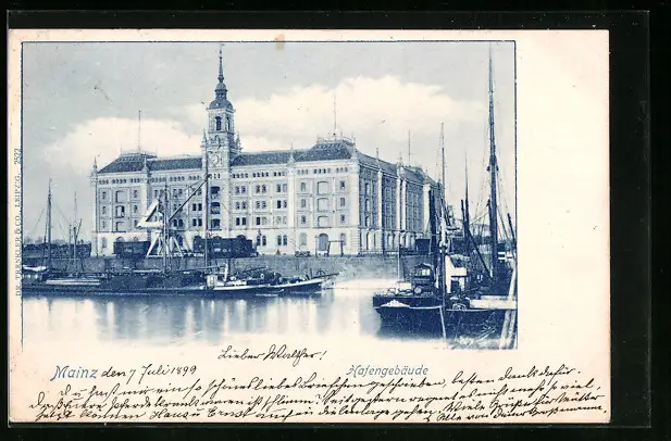 AK Mainz, Hafengebäude mit Schiffen