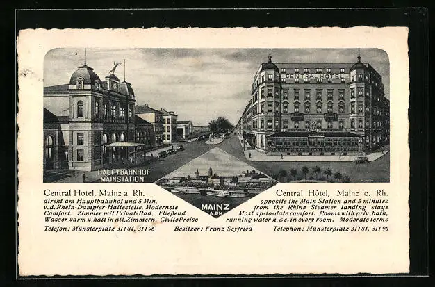 AK Mainz, Hauptbahnhof Mainstation und Central Hotel