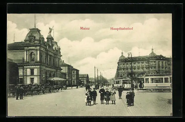 AK Mainz, Hauptbahnhof mit Strassenbahn