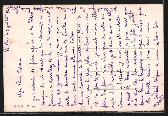 Personenbezogene Daten auf der Rückseite der Karte wurden durch blauen Textmarker unkenntlich gemacht. Die blauen Stellen sind auf die Vorderseite durchgeweicht und wirken sich negativ auf das Postkartenfoto aus