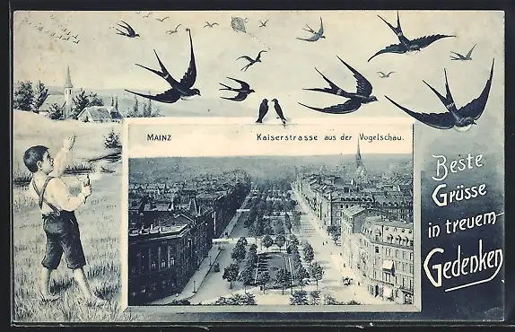 AK Mainz, Kaiserstrasse aus der Vogelschau