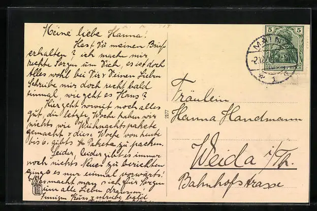 Personenbezogene Daten auf der Rückseite der Karte wurden durch blauen Textmarker unkenntlich gemacht. Die blauen Stellen sind auf die Vorderseite durchgeweicht und wirken sich negativ auf das Postkartenfoto aus