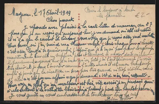 Personenbezogene Daten auf der Rückseite der Karte wurden durch blauen Textmarker unkenntlich gemacht. Die blauen Stellen sind auf die Vorderseite durchgeweicht und wirken sich negativ auf das Postkartenfoto aus