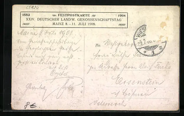 gelaufen 1908, Briefmarke entfernt, rückseitig Oberflächenschaden, guter Zustand