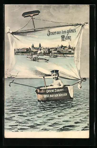 AK Mainz, Panorama mit Dampfer, Kleiner Matrose im Bottich