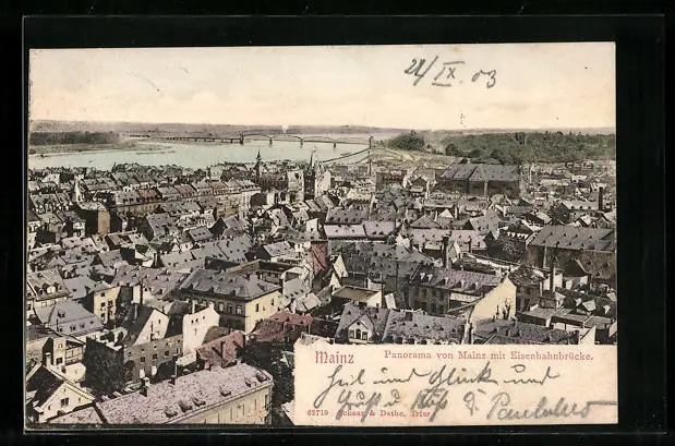 AK Mainz, Panorama mit Eisenbahnbrücke