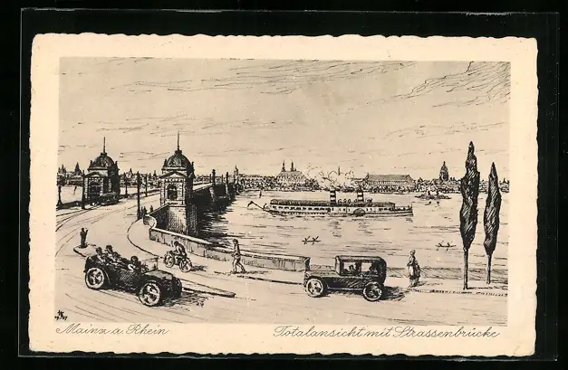 AK Mainz / Rhein, Totalansicht mit Strassenbrücke