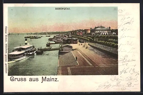 AK Mainz, Rheinquai mit Dampfer