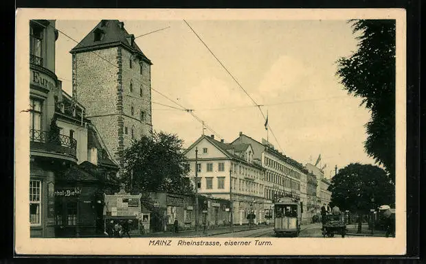 AK Mainz, Rheinstrasse, eiserner Turm, Strassenbahn