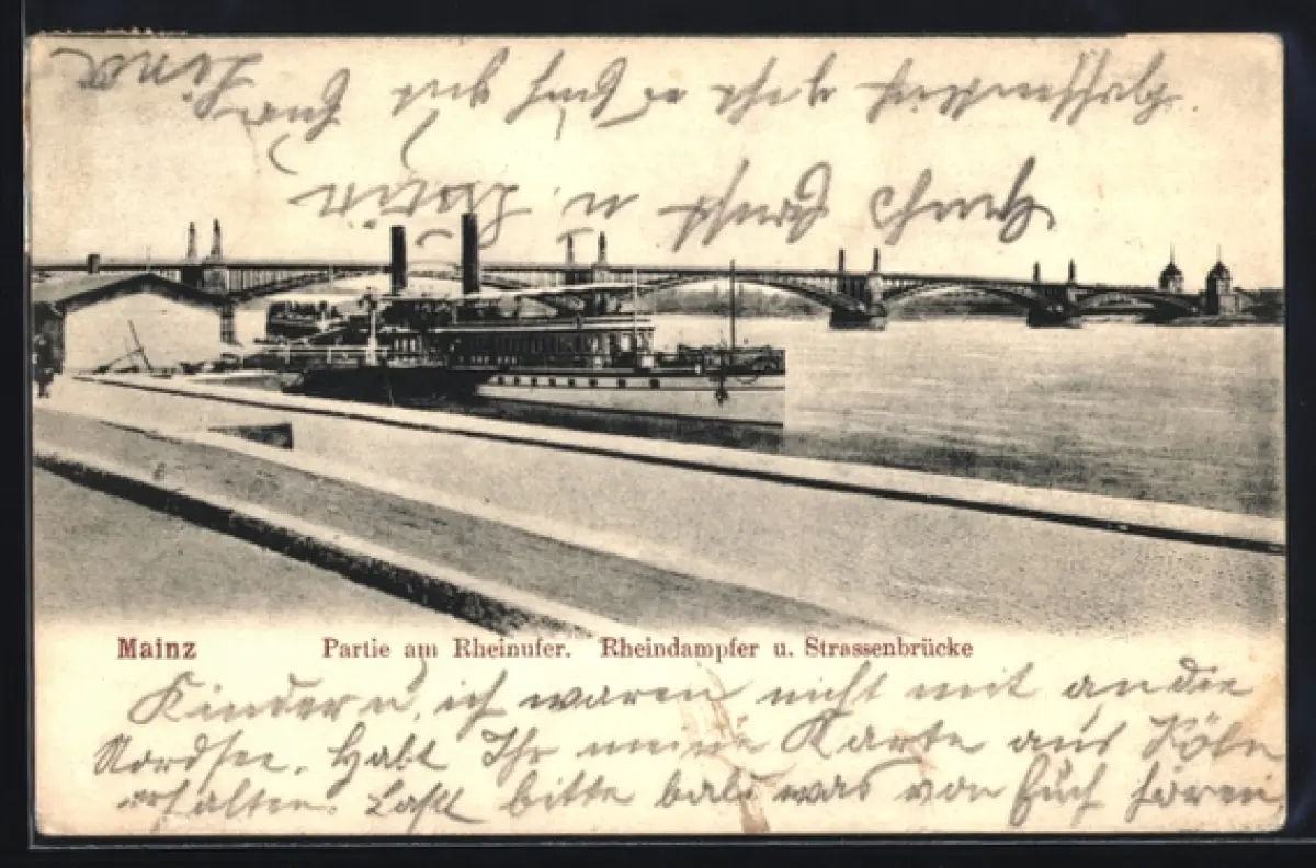 AK Mainz, Rheinufer, Rheindampfer, Strassenbrücke