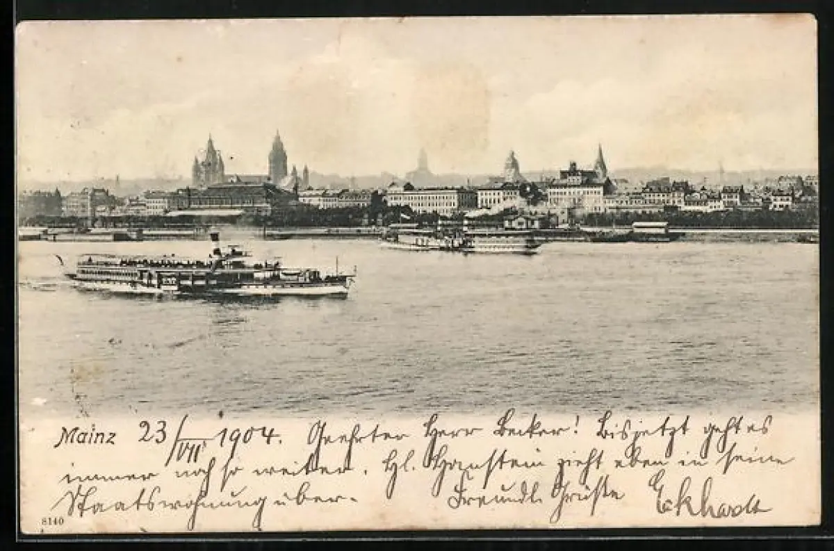 AK Mainz, Stadtansicht mit Dom und Rheinschiff