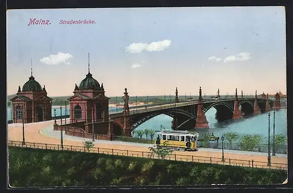 AK Mainz, Strassenbrücke mit Strassenbahn