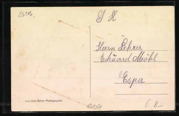 Personenbezogene Daten auf der Rückseite der Karte wurden durch blauen Textmarker unkenntlich gemacht. Die blauen Stellen sind auf die Vorderseite durchgeweicht und wirken sich negativ auf das Postkartenfoto aus