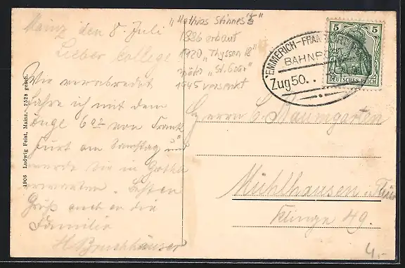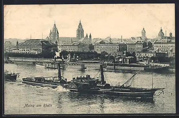 AK Mainz, Teilansicht mit Dampfer Mathias Stinnes