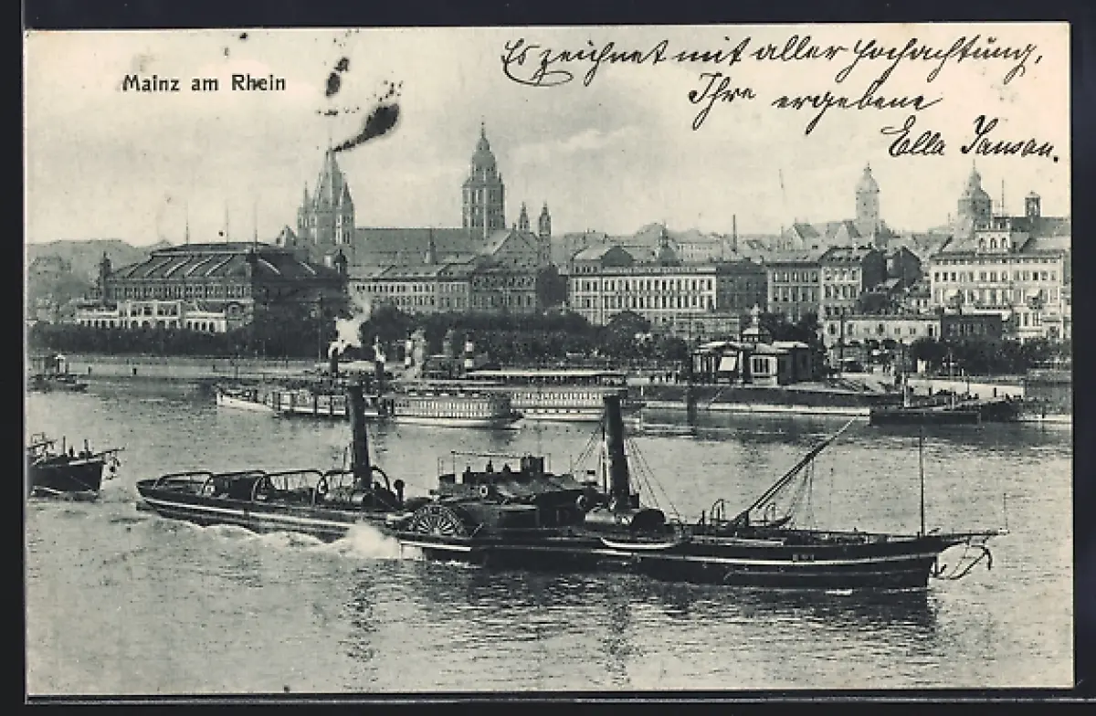 AK Mainz, Teilansicht mit Dampfer Mathus Stinnes