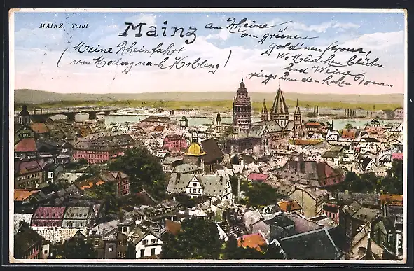 AK Mainz, Teilansicht mit Rheinblick aus der Vogelschau