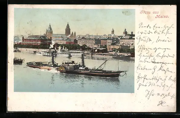 AK Mainz, Totalansicht der Stadt mit Dampfer