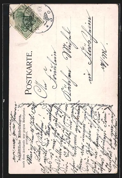 Personenbezogene Daten auf der Rückseite der Karte wurden durch blauen Textmarker unkenntlich gemacht. Die blauen Stellen sind auf die Vorderseite durchgeweicht und wirken sich negativ auf das Postkartenfoto aus