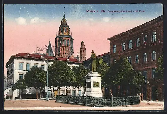 AK Mainz a. Rh., Gutenberg-Denkmal und Dom