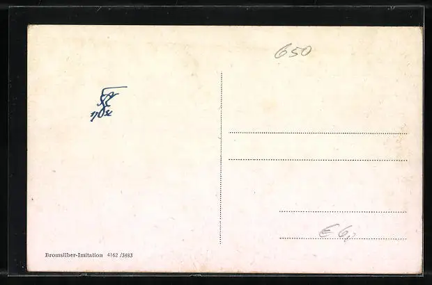 Personenbezogene Daten auf der Rückseite der Karte wurden durch blauen Textmarker unkenntlich gemacht. Die blauen Stellen sind auf die Vorderseite durchgeweicht und wirken sich negativ auf das Postkartenfoto aus