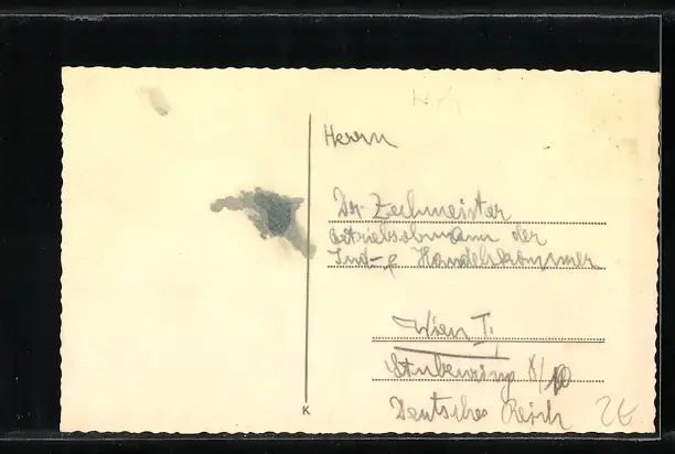 Personenbezogene Daten auf der Rückseite der Karte wurden durch blauen Textmarker unkenntlich gemacht. Die blauen Stellen sind auf die Vorderseite durchgeweicht und wirken sich negativ auf das Postkartenfoto aus
