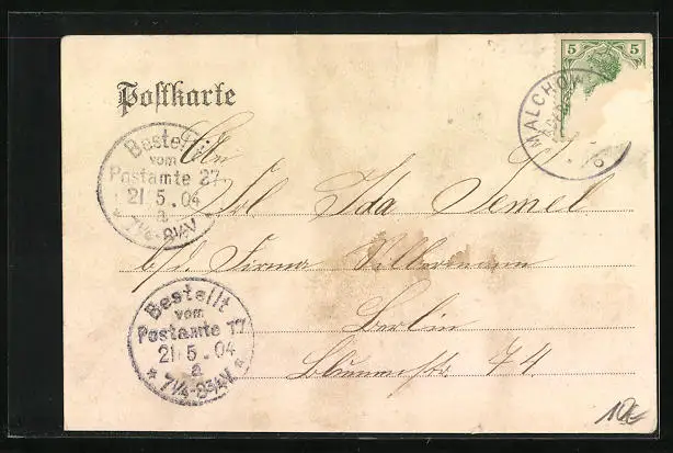 gelaufen 1904, Briefmarke entfernt, rückseitig Oberflächenschaden, minimaler Einriss unten mittig, guter Zustand