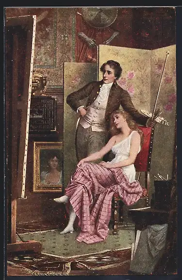 AK Maler zeigt im Atelier einer jungen Frau seine Werke