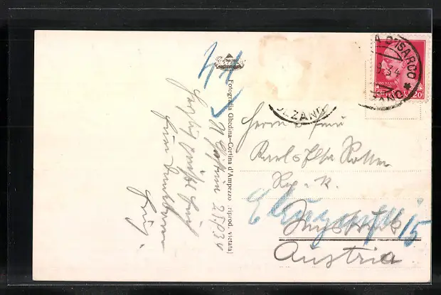 Personenbezogene Daten auf der Rückseite der Karte wurden durch blauen Textmarker unkenntlich gemacht. Die blauen Stellen sind auf die Vorderseite durchgeweicht und wirken sich negativ auf das Postkartenfoto aus