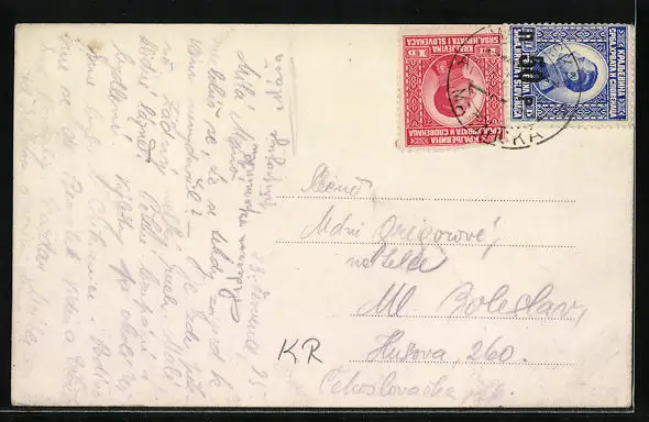Personenbezogene Daten auf der Rückseite der Karte wurden durch blauen Textmarker unkenntlich gemacht. Die blauen Stellen sind auf die Vorderseite durchgeweicht und wirken sich negativ auf das Postkartenfoto aus