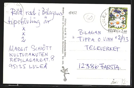 Personenbezogene Daten auf der Rückseite der Karte wurden durch blauen Textmarker unkenntlich gemacht. Die blauen Stellen sind auf die Vorderseite durchgeweicht und wirken sich negativ auf das Postkartenfoto aus