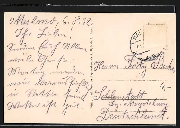alte Ansichtskarte, gelaufen 1932, Briefmarke entfernt, rückseitig Oberflächenschaden, guter Zustand