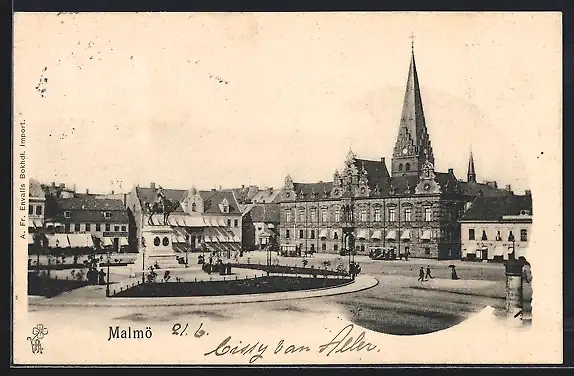AK Malmö, Strassenpartie mit Denkmal und Kirchturm