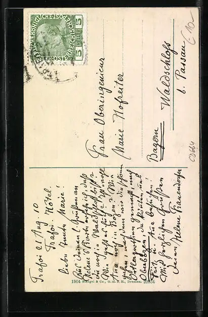 Personenbezogene Daten auf der Rückseite der Karte wurden durch blauen Textmarker unkenntlich gemacht. Die blauen Stellen sind auf die Vorderseite durchgeweicht und wirken sich negativ auf das Postkartenfoto aus