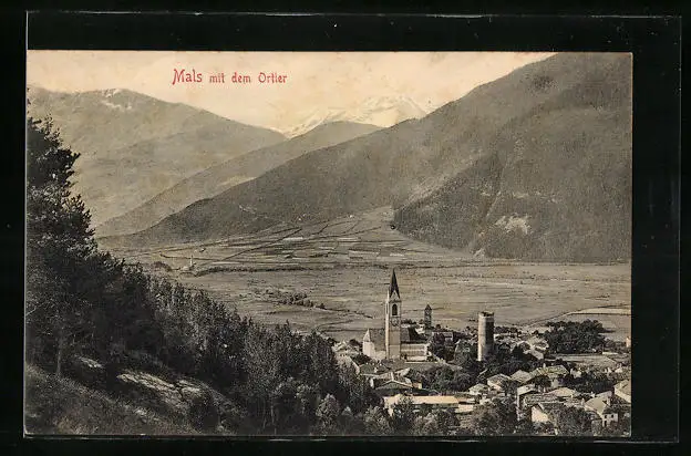 AK Mals, Teilansicht mit Kirche und dem Ortler