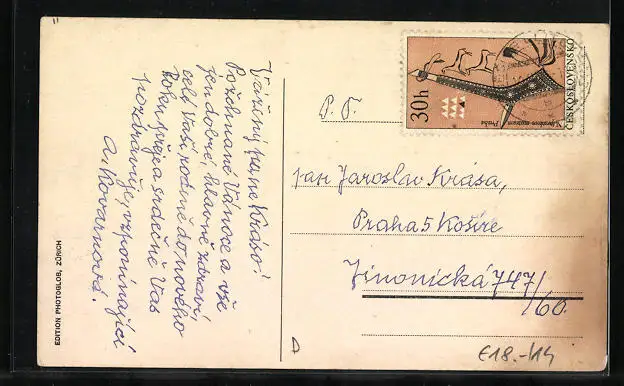 Personenbezogene Daten auf der Rückseite der Karte wurden durch blauen Textmarker unkenntlich gemacht. Die blauen Stellen sind auf die Vorderseite durchgeweicht und wirken sich negativ auf das Postkartenfoto aus