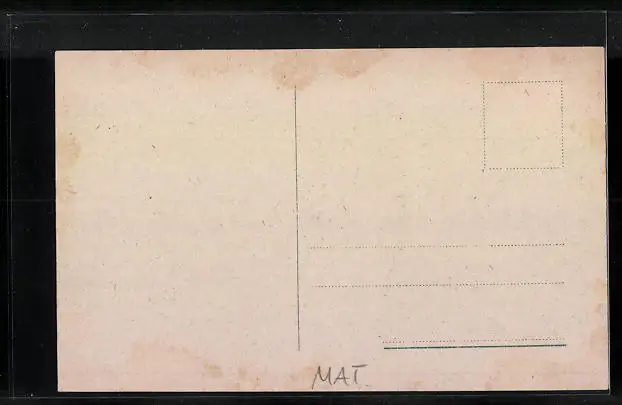 Personenbezogene Daten auf der Rückseite der Karte wurden durch blauen Textmarker unkenntlich gemacht. Die blauen Stellen sind auf die Vorderseite durchgeweicht und wirken sich negativ auf das Postkartenfoto aus