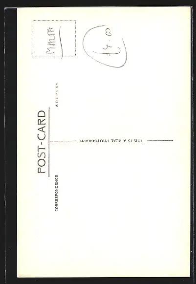 Personenbezogene Daten auf der Rückseite der Karte wurden durch blauen Textmarker unkenntlich gemacht. Die blauen Stellen sind auf die Vorderseite durchgeweicht und wirken sich negativ auf das Postkartenfoto aus