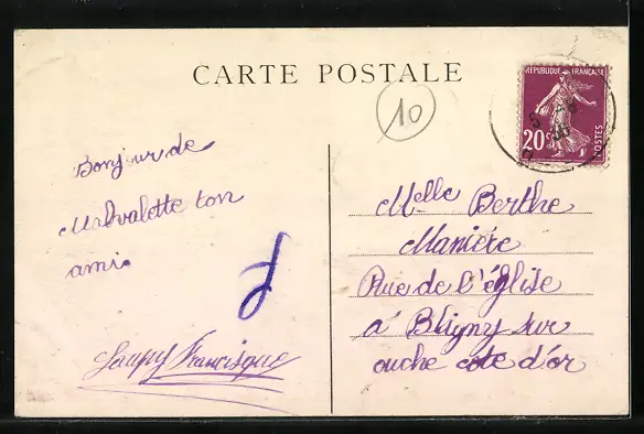 Personenbezogene Daten auf der Rückseite der Karte wurden durch blauen Textmarker unkenntlich gemacht. Die blauen Stellen sind auf die Vorderseite durchgeweicht und wirken sich negativ auf das Postkartenfoto aus