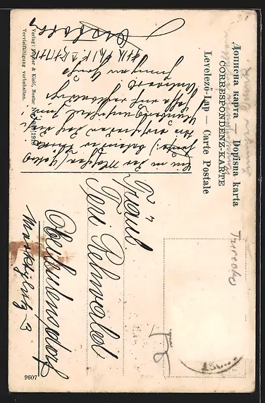 Personenbezogene Daten auf der Rückseite der Karte wurden durch blauen Textmarker unkenntlich gemacht. Die blauen Stellen sind auf die Vorderseite durchgeweicht und wirken sich negativ auf das Postkartenfoto aus