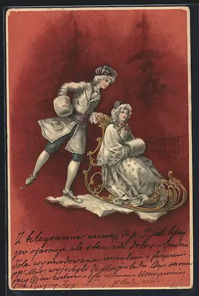 AK Mann auf Schlittschuhen schiebt Schlitten der Frau