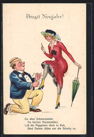 AK Mann bindet einer Frau im Kleid die Schuhe zu, Erotik