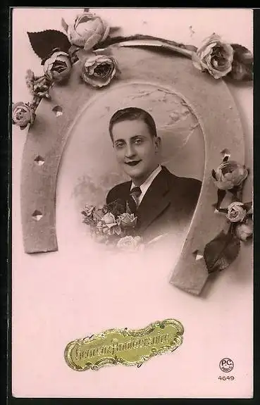 AK Mann in Hufeisen mit Rosen, Heureuse Anniversaire