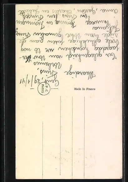 Personenbezogene Daten auf der Rückseite der Karte wurden durch blauen Textmarker unkenntlich gemacht. Die blauen Stellen sind auf die Vorderseite durchgeweicht und wirken sich negativ auf das Postkartenfoto aus