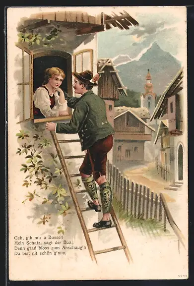 AK Mann in Tracht beim Fensterln, Erotik