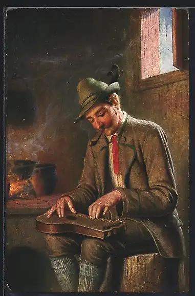 AK Mann in Tracht raucht Pfeife und spielt Zither