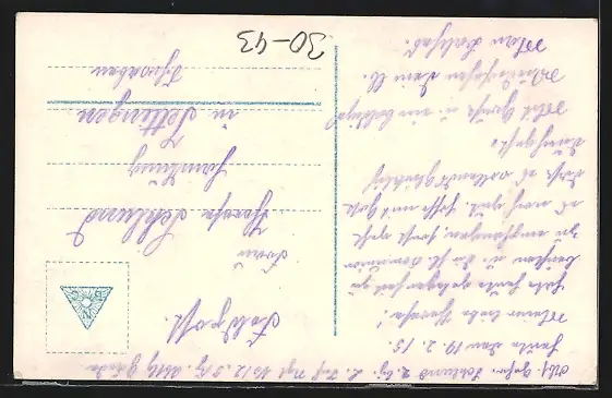 Personenbezogene Daten auf der Rückseite der Karte wurden durch blauen Textmarker unkenntlich gemacht. Die blauen Stellen sind auf die Vorderseite durchgeweicht und wirken sich negativ auf das Postkartenfoto aus