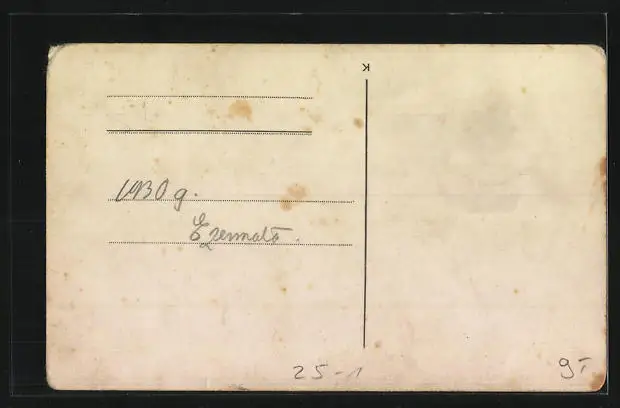 Personenbezogene Daten auf der Rückseite der Karte wurden durch blauen Textmarker unkenntlich gemacht. Die blauen Stellen sind auf die Vorderseite durchgeweicht und wirken sich negativ auf das Postkartenfoto aus