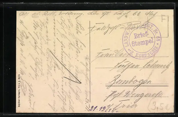 Personenbezogene Daten auf der Rückseite der Karte wurden durch blauen Textmarker unkenntlich gemacht. Die blauen Stellen sind auf die Vorderseite durchgeweicht und wirken sich negativ auf das Postkartenfoto aus