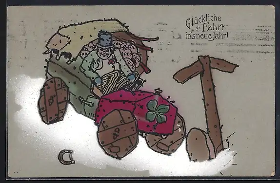 AK Mann mit Geldsäcken in einem Auto aus Holz, Neujahrskarte